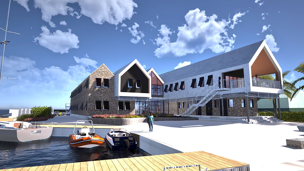 Our design for the new ADOMS Headquarters building in St. Johns Antigua has gone out to tender, with construction to commence this year. Using an innovative highly insulated prefabricated wall construction, the building will not only save on construction costs by facilitating faster completion on site, but as it is designed to high environmental standards it will save significantly on lifetime running costs - it will be LEED certified and will consume significantly less energy than a standard office building whilst generating the majority of energy required for the day to day running on site via solar canopies, and rsignificant water storage for harvested rainwater will be used for a greywater circuit for washrooms, general maintenance and landscaping meaning that less potable water is used on a daily basis, and is not wasted where it is not needed, The entire complex is designed and engineered to be natural disaster resilient, elevated above predicted storm surge, and calculated to structurally resist up to category 5 hurricanes.